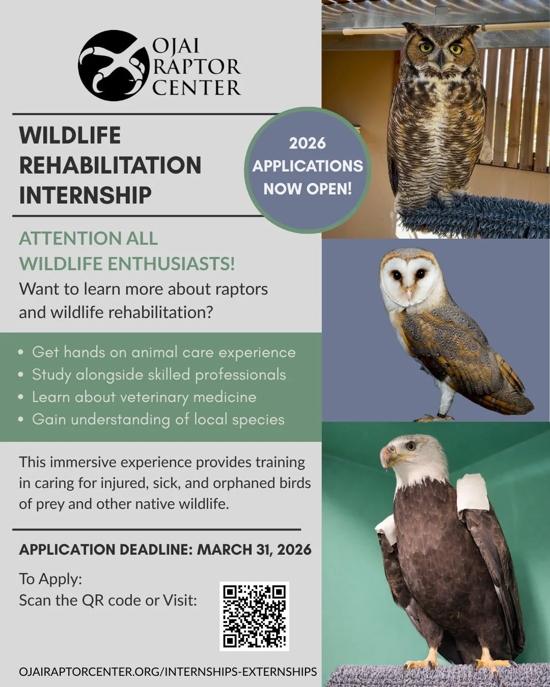 Ojai Raptor Center is dedicated to the care and protection of wildlife through the rehabilitation and release of sick, injured, and orphaned wildlife, participating in scientific discoveries that improve the standards of care for wildlife undergoing rehabilitation, and educating and inspiring the community to become stewards of our environment.